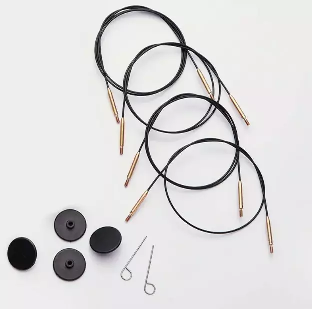 KnitPron ruostumattomasta teräksestä valmistetut vaihtokaapelit, jotka on päällystetty nailonilla. Jokaisen johdon mukana toimitetaan päätykappaleet