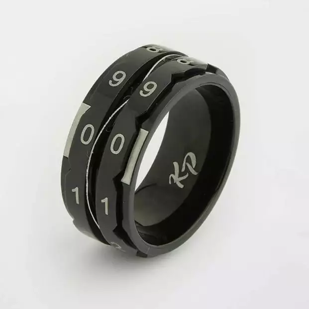 Ruostumattomasta teräksestä valmistettu kerroslaskinsormus. Koko 7 (17,3mm). Pakattu paperilaatikkoon.