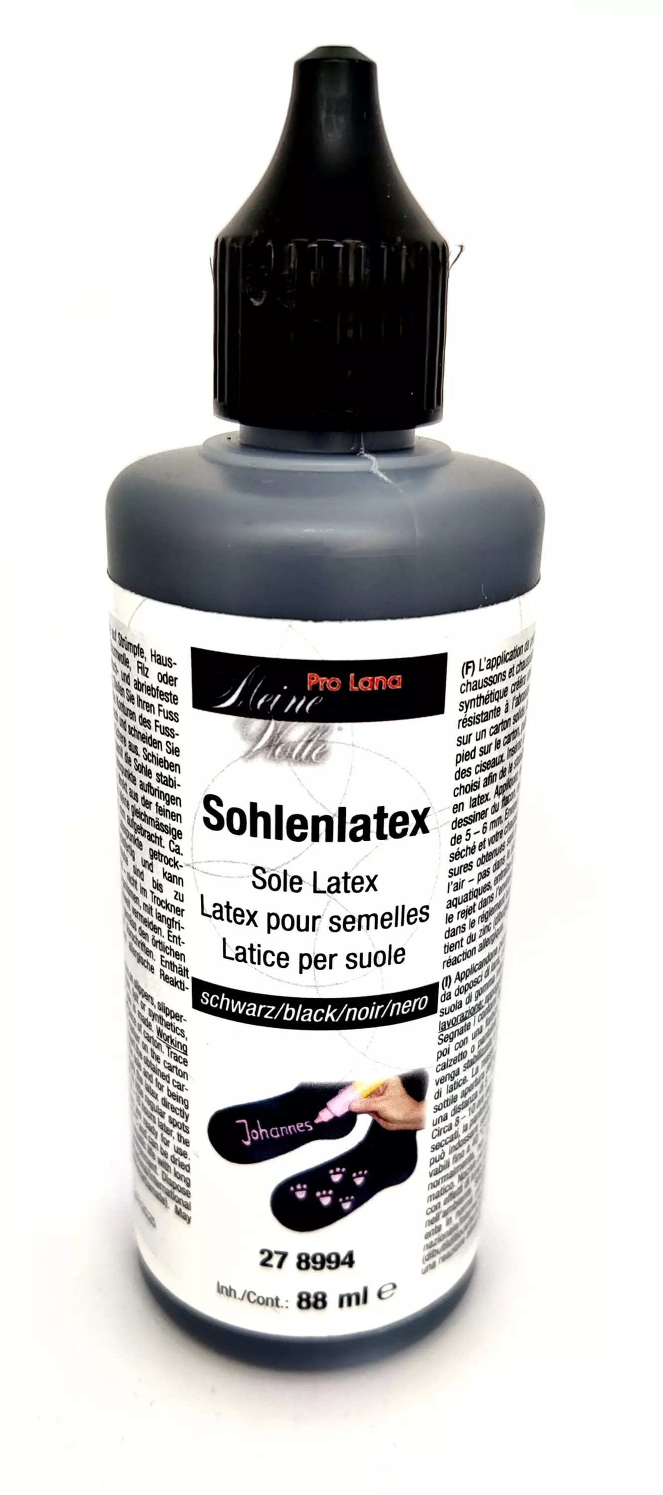 Sole latexilla - liukuesteaineella teet itsetehdyistä villasukista ja -tossuista liukumattomat. 88ml pullo. Käyttöohje: Aseta pala pahvia sukan tai tossun