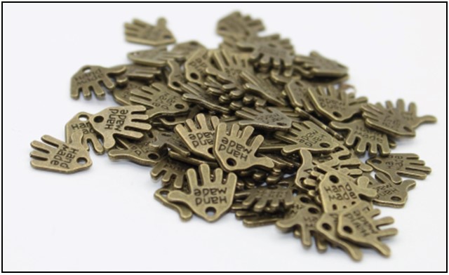Metallinen, tumma kädenmuotoinen merkki, joss teksti HAND MADE. Koko 13x12mm.