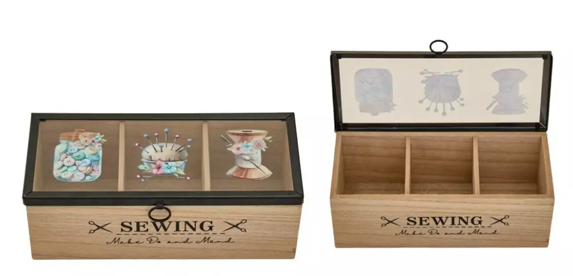 Hemline laadukas MDL vanerinen ompelu boxi. Kansi akryylia metalli kehyksin. Koko L24 x W10 x H9 cm.