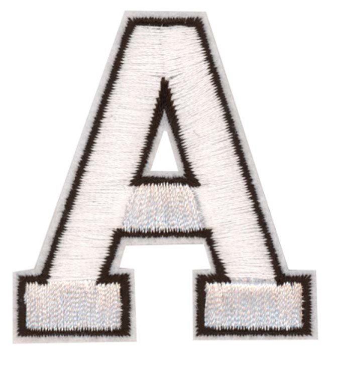 Laadukas silitettävä brodeerattu Aakkosmerkki. Kiinnitetään silittämällä, voidaan myös ommella. Merkin korkeus n. 55mm. Väri valkoinen mustat reunat.