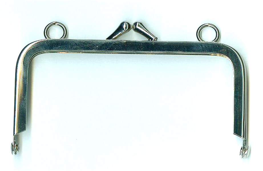 Laadukas pieni metallinen kukkaronkehys olkainketju lenkeillä. Kiinnitys tekstiililiimalla. Leveys 10cm. Väri nikkeli.