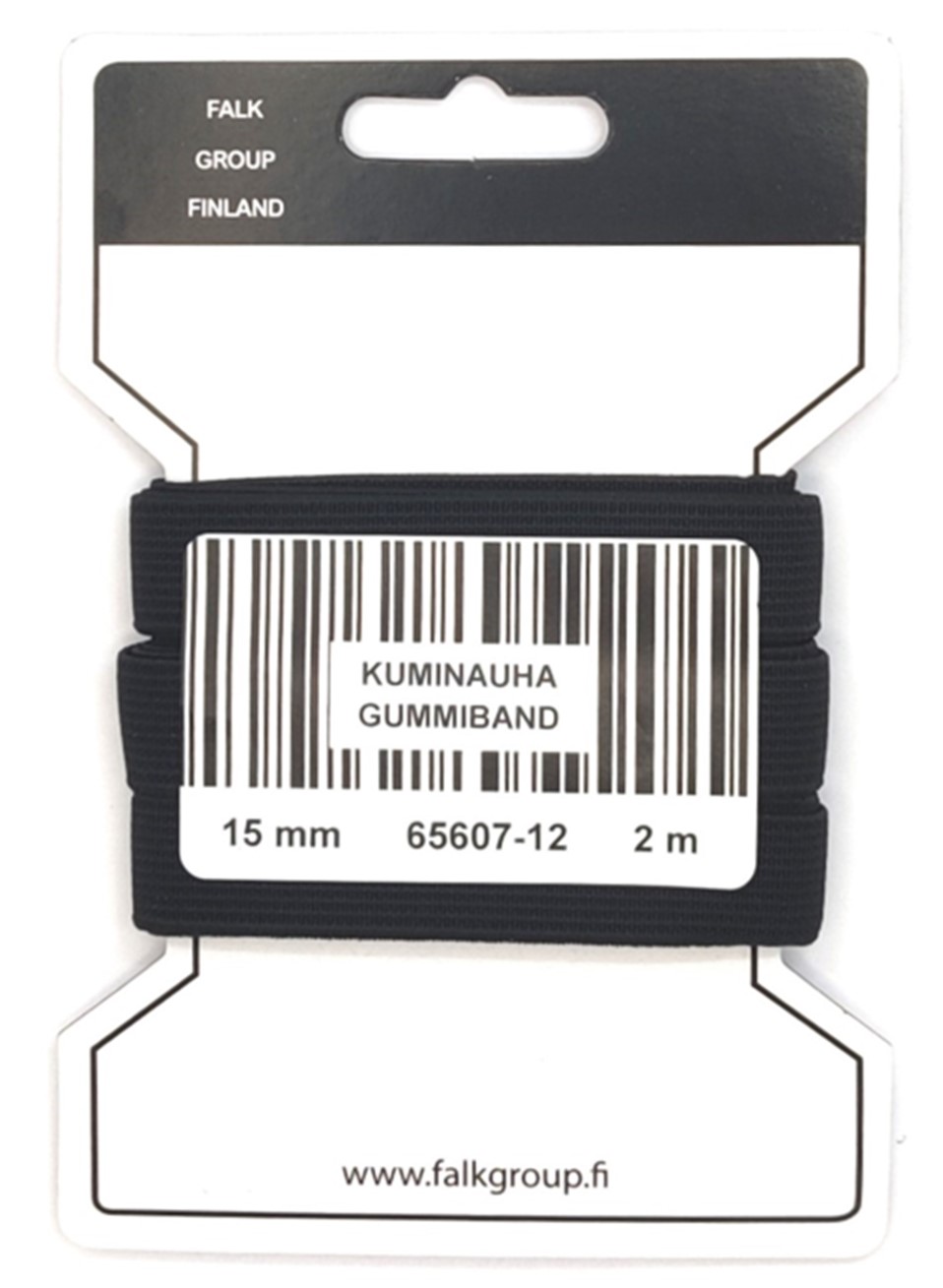 Kuluttajapakkaus. Laadukas ja joustava peruskuminauha 15mm. Voi ommella päältä tai pujottaa kujaan. Väri musta.