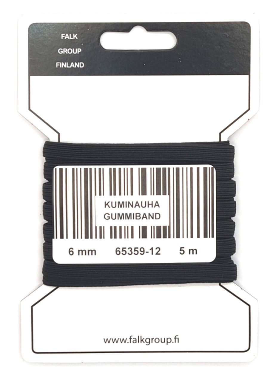 Kuluttajapakkaus. Laadukas ja joustava peruskuminauha 6mm. Voi ommella päältä tai pujottaa kujaan. Väri musta.