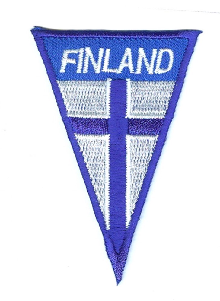 Laadukas silitettävä brodeerattu merkki. Voidaan myös ommella. Suomen lippu aihe. Merkki viirin muotoinen, korkeus 70mm leveys 50mm .