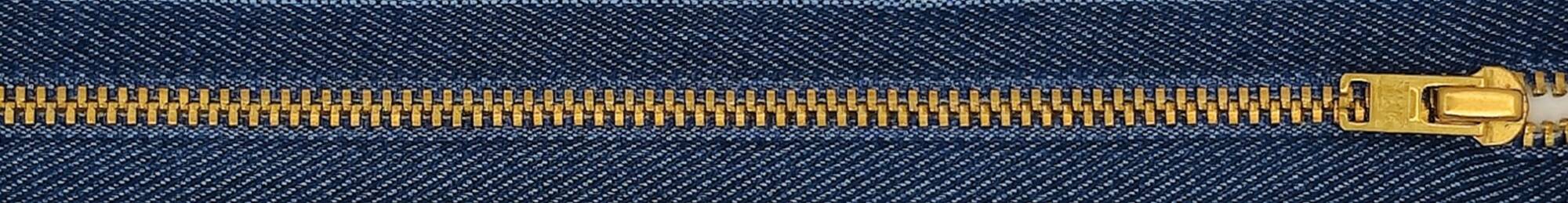YKK laadukas metalliketju 4mm Farkku. Ketju on umpiketju. Sopii hyvin housuvetoketjuksi. Hammasosa kullanvärinen metalli, reunanauha polyesteriä. Väri farkunsininen.