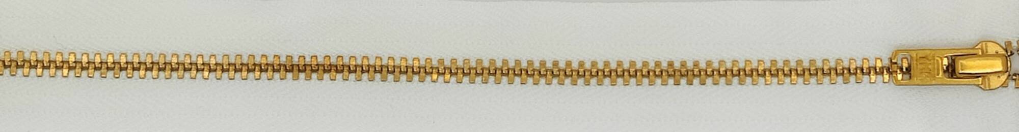 YKK laadukas metalliketju 4mm Farkku. Ketju on umpiketju. Sopii hyvin housuvetoketjuksi. Hammasosa kullanvärinen metalli, reunanauha polyesteriä. Väri valkoinen.