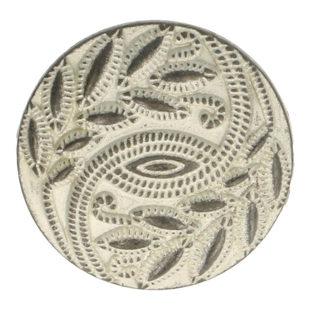 Metallinen kantanappi. Napin pinnalla musta lehti kuvio.