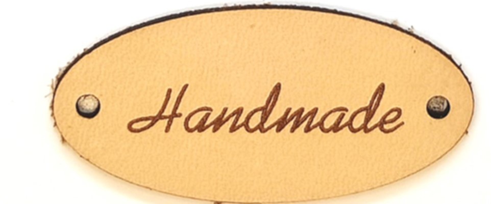 Ovaalin muotoinen ommeltava nahkamerkki. Nahka on laadukasta parkkinahkaa. Teksti "Handmade" (kaunokirjoituksella). Koko 53mm x 25mm. Väri luonnonvärinen.
