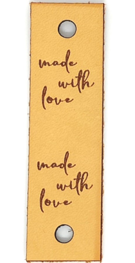Nahkamerkki "nasta" kiinnityksellä. Nahka on laadukasta parkkinahkaa. Teksti "made with love" . Koko 20mm x 70mm. Väri luonnonvärinen.