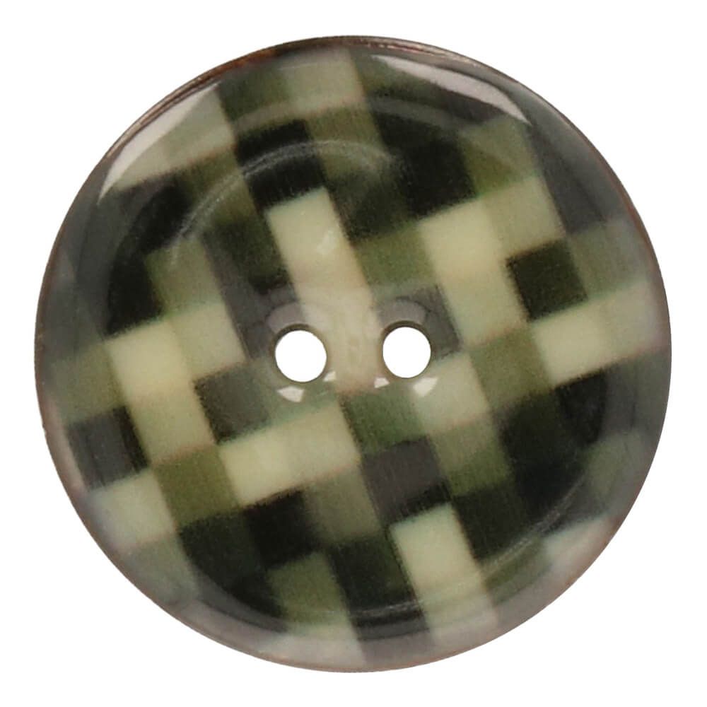 Muovinen 2-reikäinen nappi, ruutukuvio harmaan ja purppuran sävyin