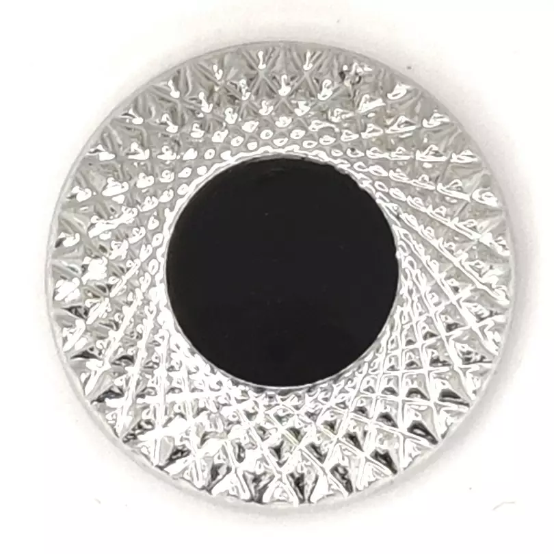 Strassinappi hopeinen kehys minkä keskus on musta. Halkaisija 18 mm. Napissa on kanta.