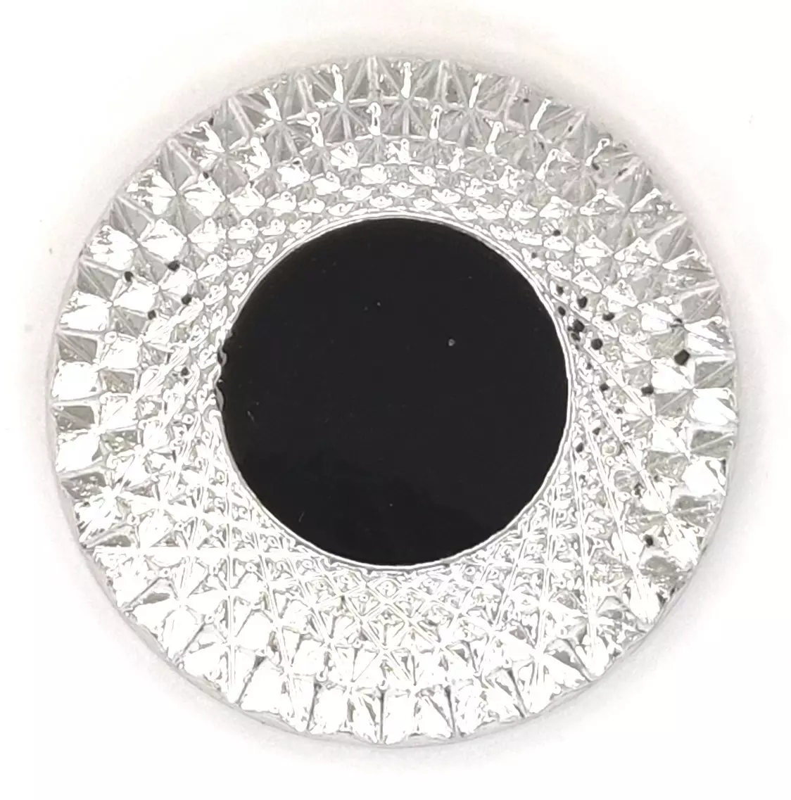 Strassinappi hopeinen kehys minkä keskus on musta. Halkaisija 26 mm. Napissa on kanta.
