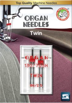 Korkea laatuinen Organ Needles -kaksoisneula soveltuu punosten ja koristeompeleiden ompeluun tavallisella kotiompelukoneella. Neulan koko 80/2,5mm neulaväli.