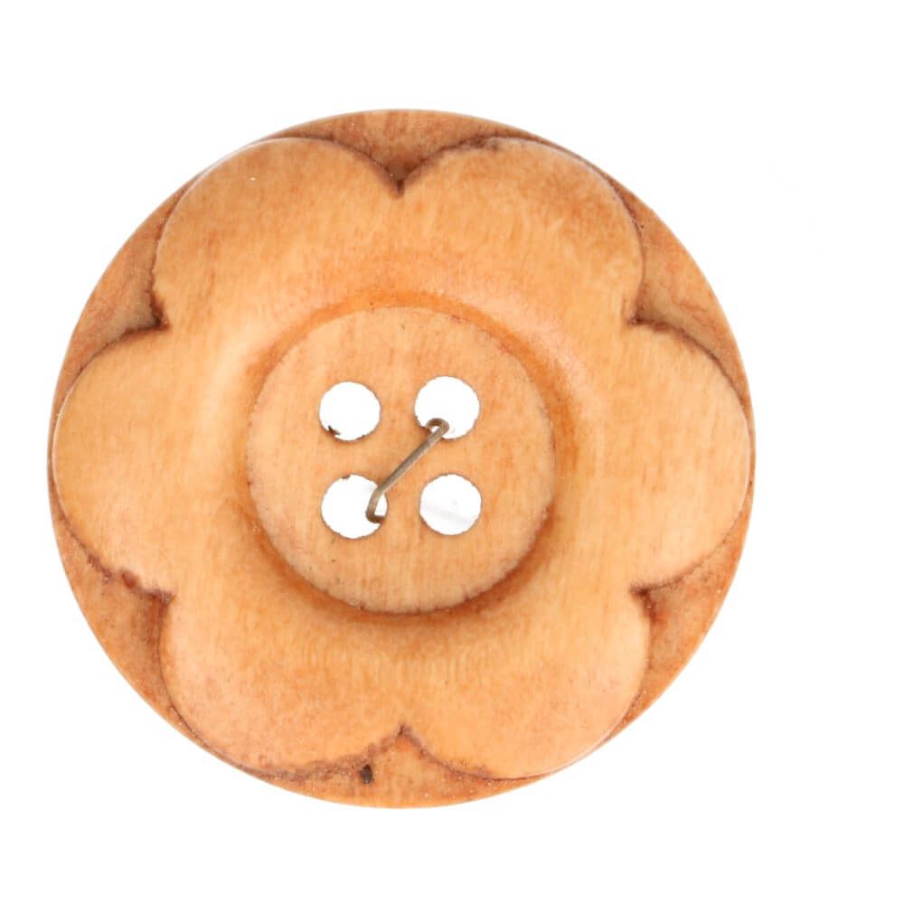 Puinen 4-reikäinen nappi. Nappissa kukkakuvio.