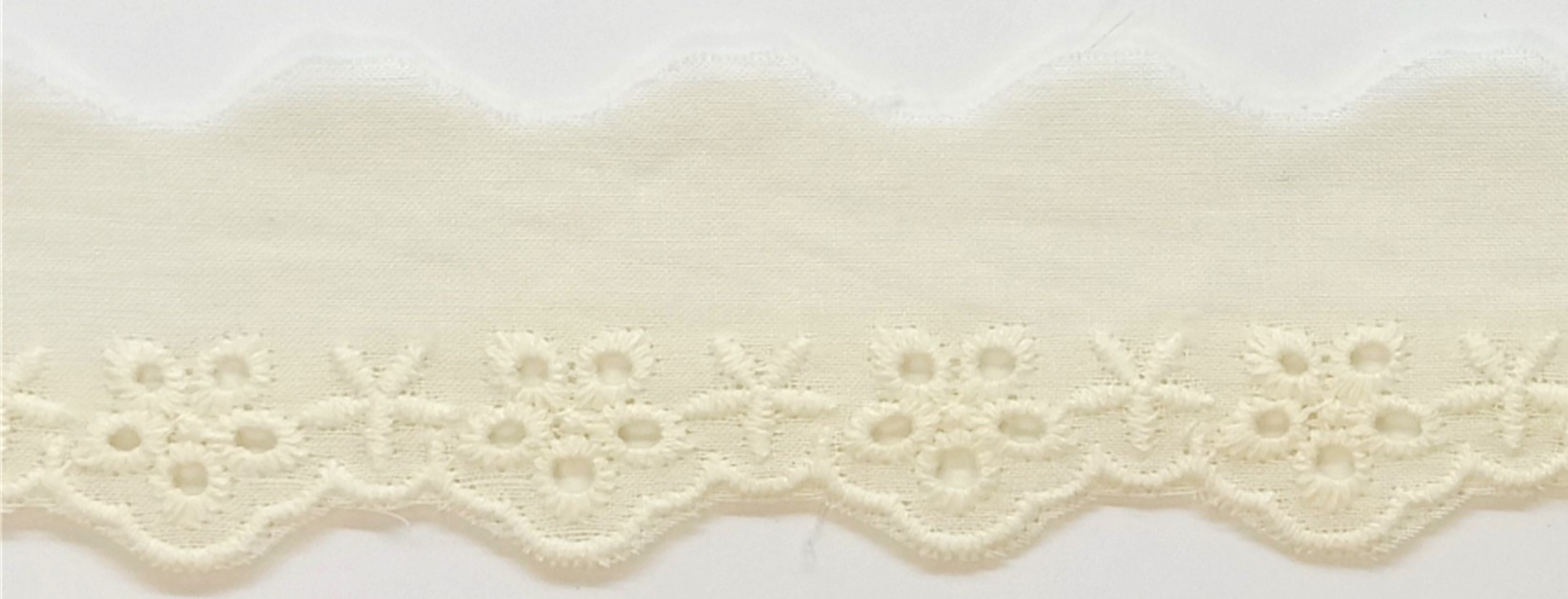 Laadukas leveä puuvilla reuna brodyyri. Lev. 35mm. Väri ecru.