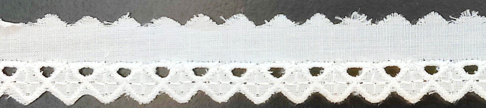 Laadukas kapea puuvilla reuna brodyyri 20 mm. Väri valkoinen.