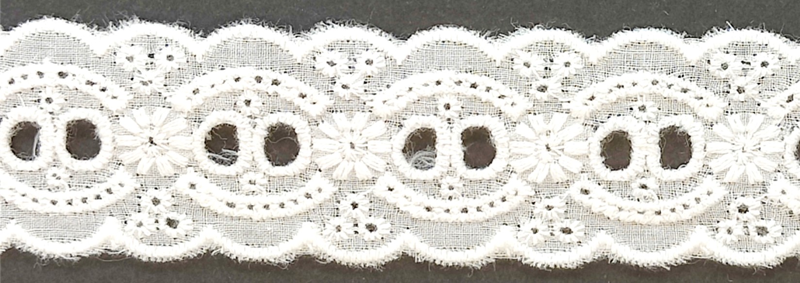 Laadukas puuvilla brodyyri. Keskellä nauhakuja. Lev. 35mm. Väri valkoinen.