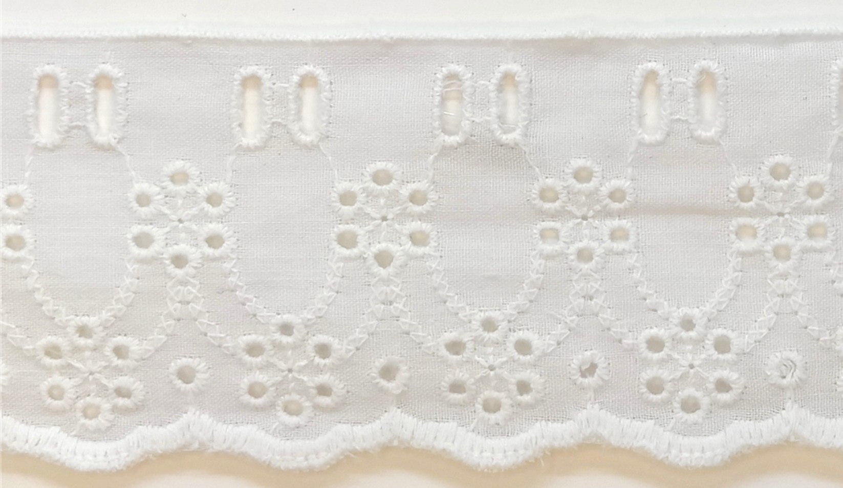Laadukas puuvilla reuna brodyyri. Reunassa nauhakuja. Lev. 58mm. Väri valkoinen.