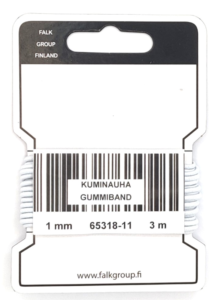 Kuluttajapakkaus. Laadukas ja joustava pyöreä 1mm kuminauha. Soveltuu esim. nappilenkiksi, ompeluun ja askarteluun. Väri valkoinen.