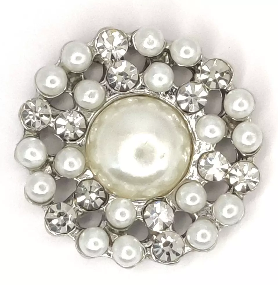 Kannallinen Strassinappi, keskellä helmi jota ympäröi pienet helmet ja kirkkaat strassikivet. Nikkelivapaa. Halkaisija 21 mm.