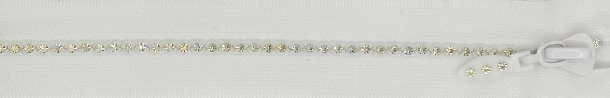 Laadukas strassivetoketju. Avoketju, jossa jokaisessa hampaassa on muovistrassi. Käyttö juhlavaatteet. Hammas osa muovia, reunanuha polyesteriä. Väri valkoinen.