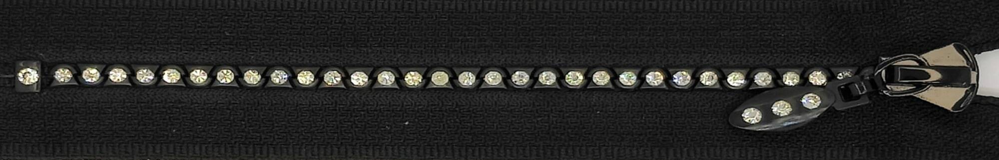 Laadukas strassivetoketju. Umpihammasketju, jossa jokaisessa hampaassa on muovistrassi. Käyttö juhlavaatteet. Hammas osa muovia, reunanuha polyesteriä. Väri musta.